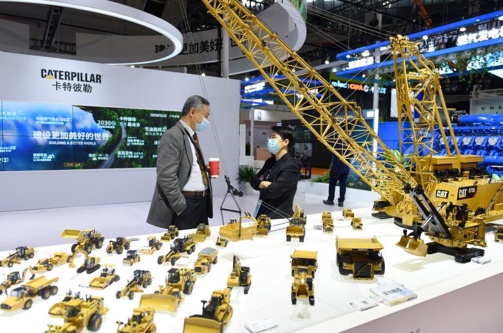 参观者在第四届进博会技术装备展区卡特彼勒展台沟通交流。新华社记者 徐亮 摄