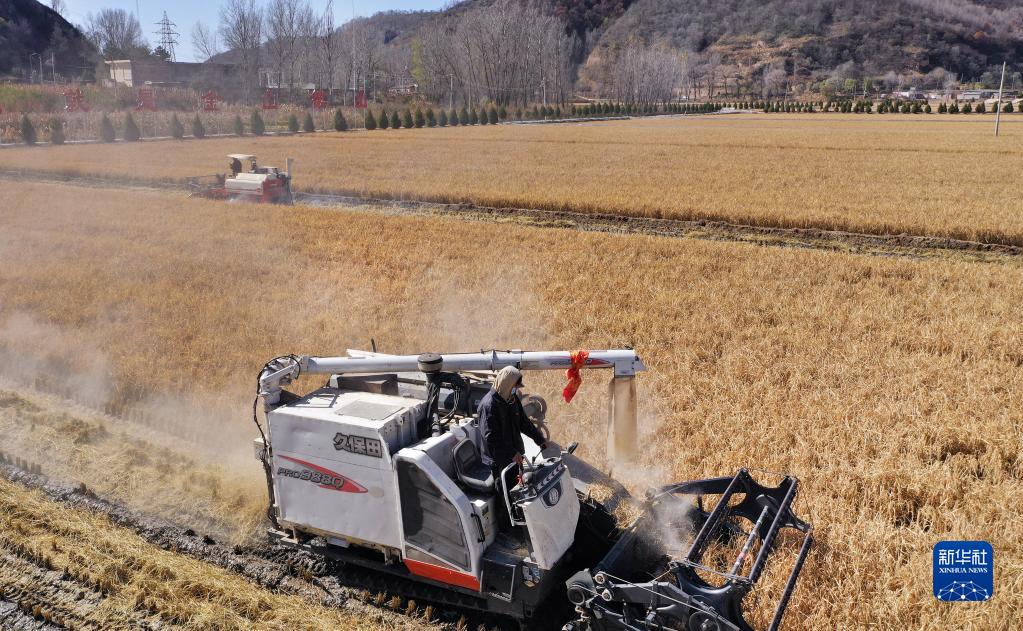 收割机在延安市南泥湾镇收割水稻(2020年10月23日摄,无人机照片)。新华社记者 陶明 摄