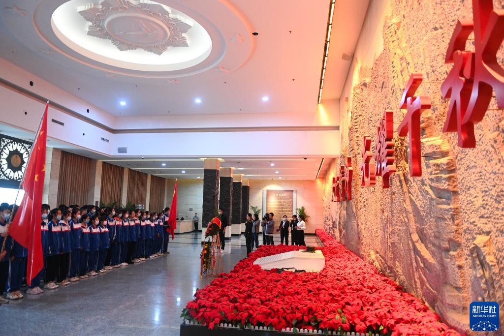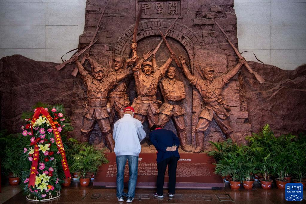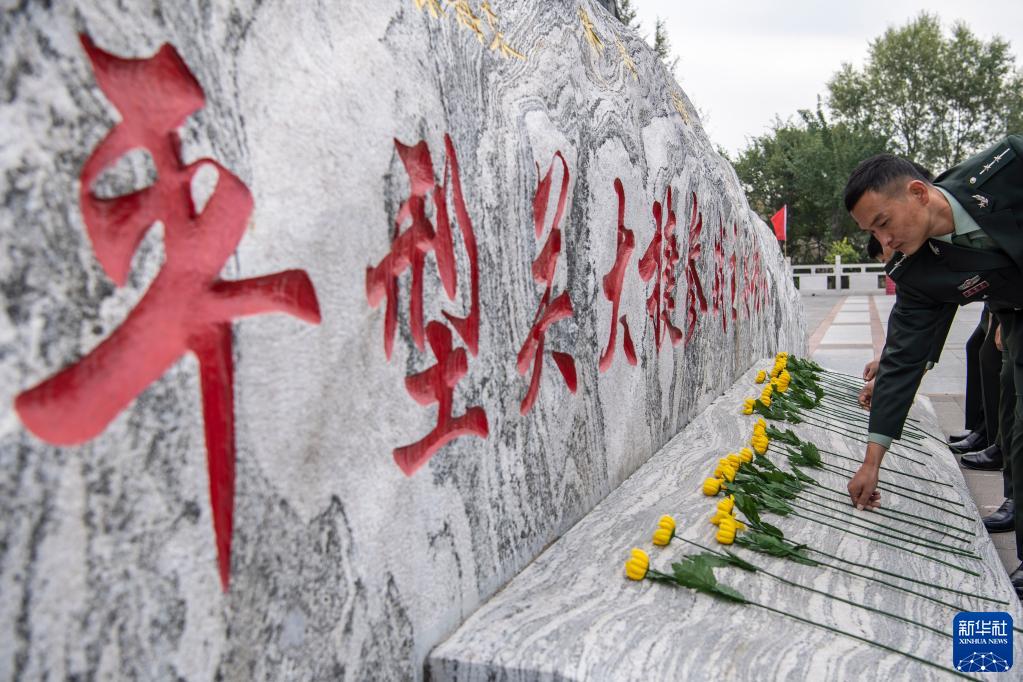 2020年9月25日,在位于山西省大同市灵丘县的平型关大捷纪念馆,工作人员向革命先烈献花。新华社记者 杨晨光 摄