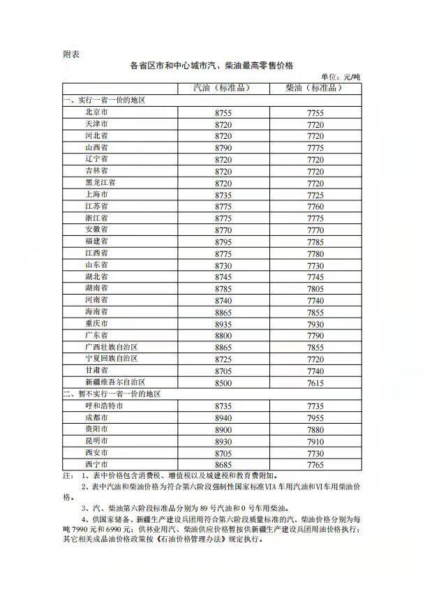 附:各省区市和中心城市汽、柴油最高零售价格