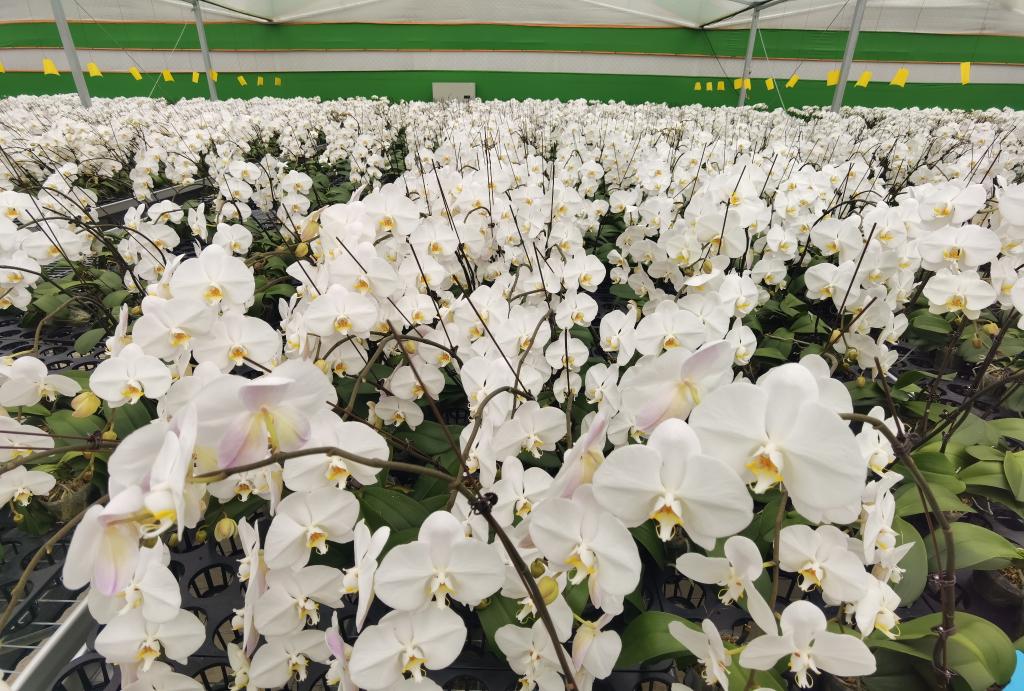 在山东省平度市旧店镇的蝴蝶兰基地内,花床上的一株株蝴蝶兰苗根茎粗壮、叶片肥硕,55万株蝴蝶兰竞相绽放、生机盎然。