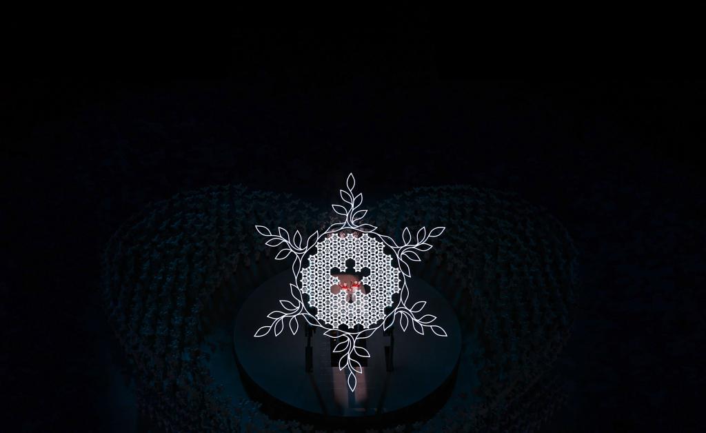 2月4日晚,第二十四届冬季奥林匹克运动会开幕式在北京国家体育场举行。图为火炬手迪妮格尔·衣拉木江和赵嘉文准备将火炬嵌入“大雪花”中央。新华社记者陈益宸摄
