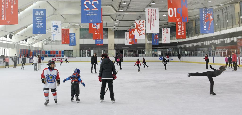 2月9日,孩子们在朝阳大悦城的冰雪运动馆体验和学习滑冰、冰球等冰上运动。新华社记者李欣摄