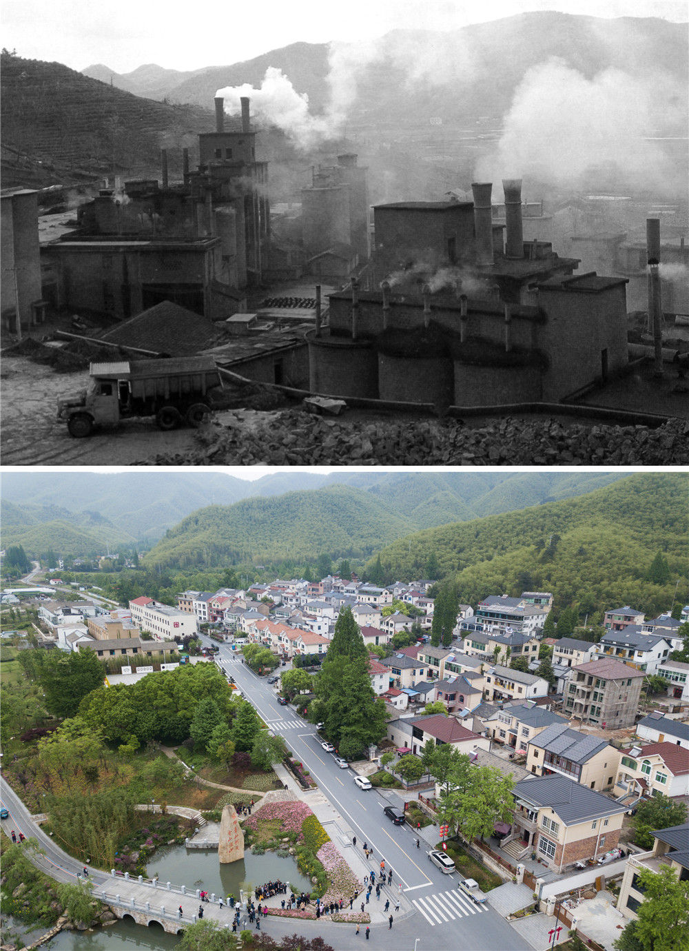 拼版照片:上图为浙江省湖州市安吉县天荒坪镇余村二十世纪八十年代的资料照片;下图为2018年4月24日,游客在整修一新的余村游览(新华社记者翁忻旸摄)。新华社发