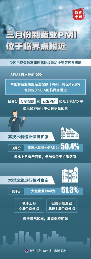 受国内疫情散发和国际地缘政治冲突等因素影响,31日出炉的中国制造业采购经理指数(PMI)降至49.5%,但仍位于50%的临界点附近,且部分分项指数和行业PMI仍处于较好水平,显示经济运行中仍有积极因素。
