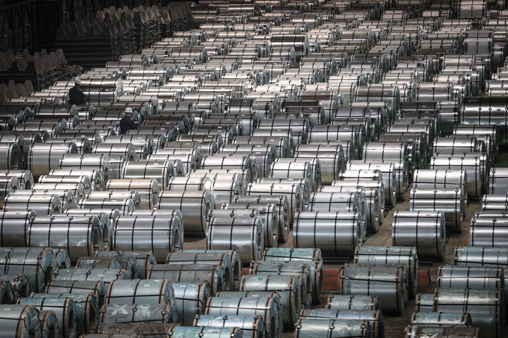 工人在鞍钢集团鞍钢股份冷轧厂四、五号镀锌线镀锌板卷成品区检查产品(2021年4月20日摄)。新华社记者 潘昱龙 摄