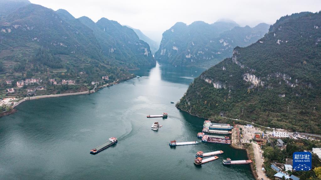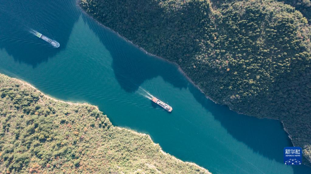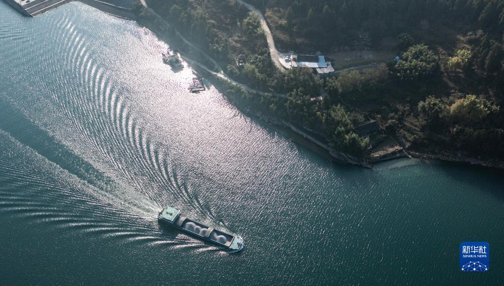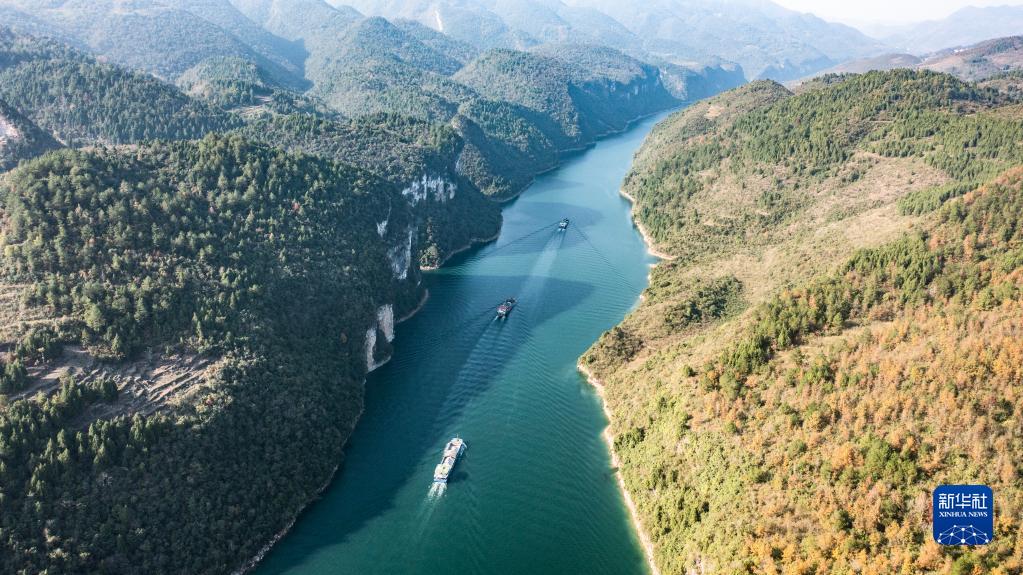 运载磷矿石的货船沿乌江航道顺流航行(2021年11月18日摄,无人机照片)。新华社记者 陶亮 摄