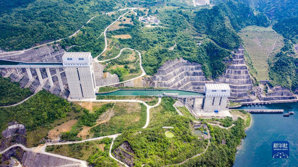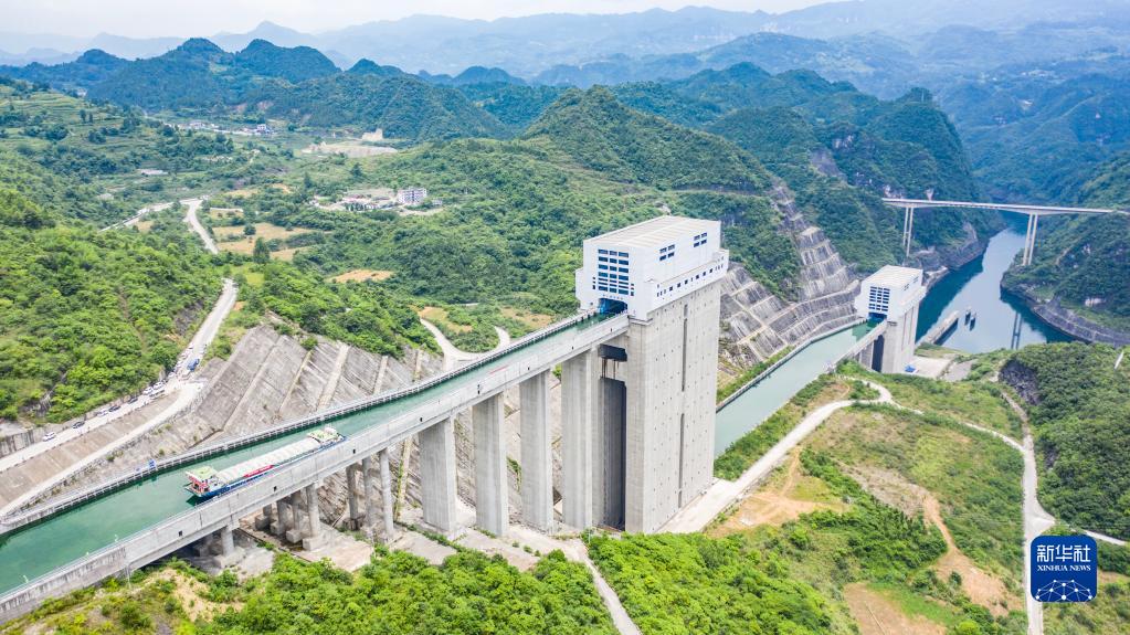 2021年6月投入试运行的构皮滩水电站配套的通航工程,被视为贵州通江达海的关键。构皮滩通航水头高差达199米,采用三级垂直升船机运行,船只通过乌江构皮滩水电站都要搭乘“水上电梯”,呈现出“水在空中悬,船在天上行”的奇景。