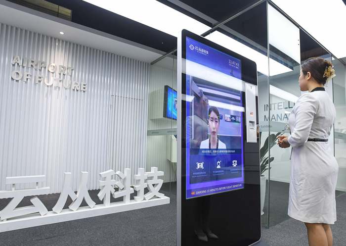 工作人员在广州南沙云从科技展厅演示“智慧航显”应用场景,该技术已经在北京大兴国际机场等机场得到应用(6月15日摄)。
