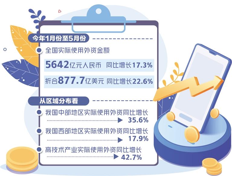 最新发布的数据显示,2022年1月份至5月份,全国实际使用外资金额5642亿元人民币,同比增长17.3%,折合877.7亿美元,同比增长22.6%。前5个月我国吸收外资保持了平稳增长,这充分说明我国在基础设施、人力资源、产业配套等方面依然拥有较强的综合比较优势,市场吸引力不减。