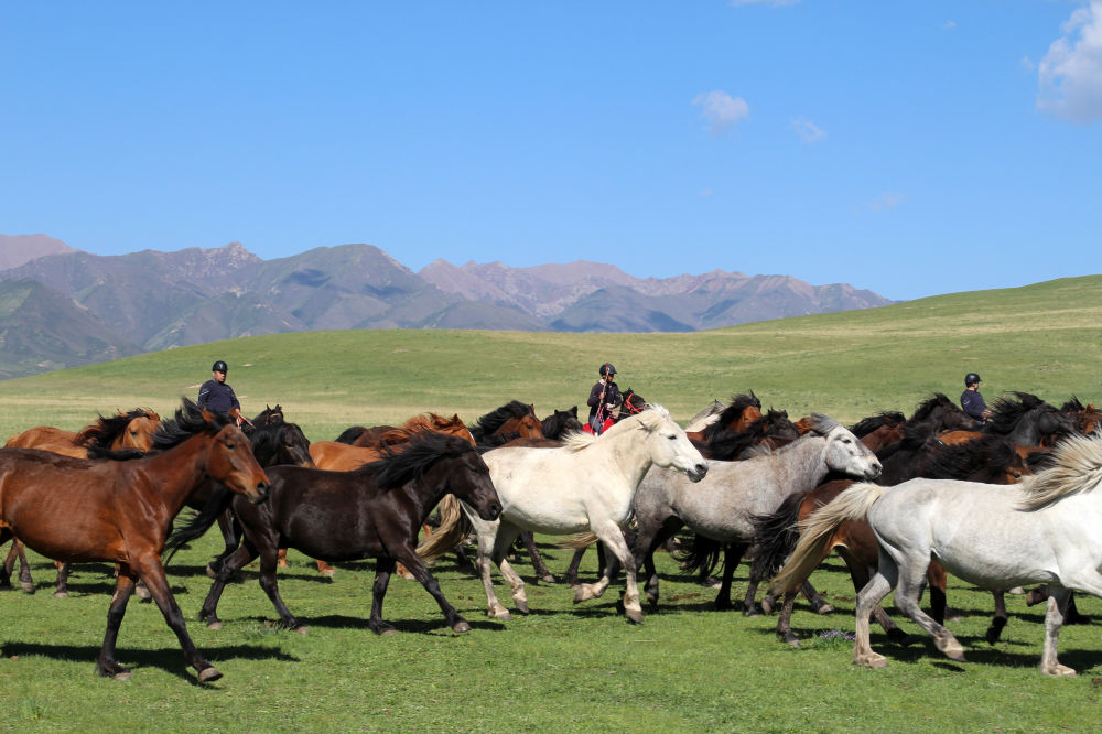 山丹马场一场的牧马人在放马,如今的山丹马场正努力打造国家优质马种质资源保护及速力型赛马培育基地(6月10日摄)。新华社记者 张智敏 摄