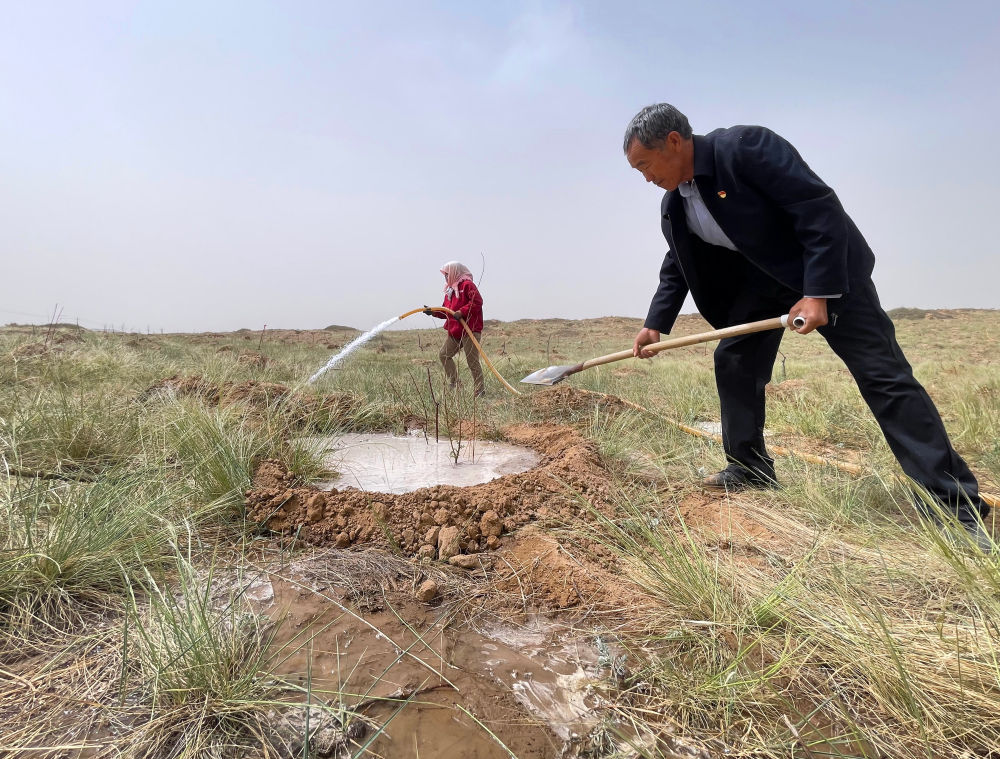 甘肃省武威市古浪县八步沙林场场长郭万刚(右)与林场职工为新种树苗浇水(5月6日摄)。新华社记者 郭刚 摄