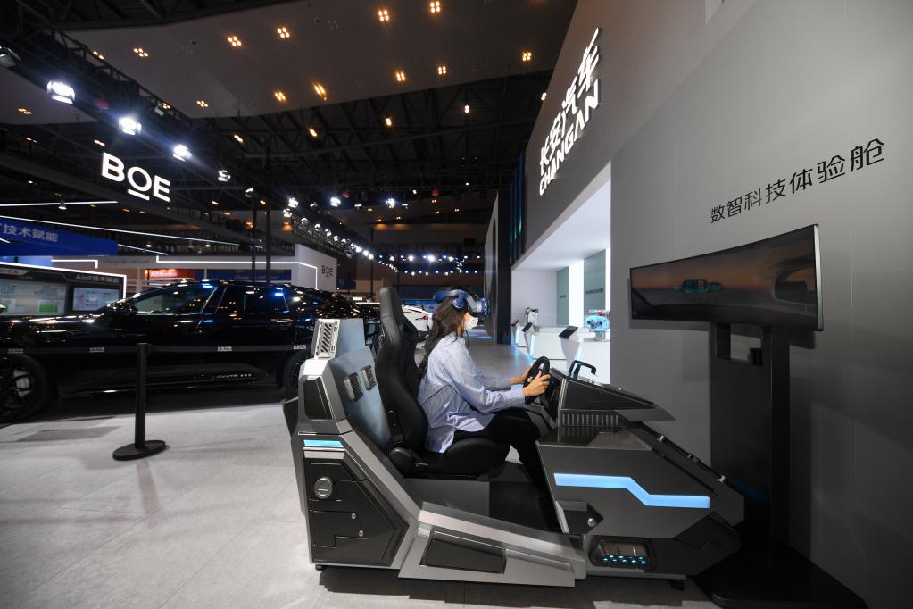 8月21日,媒体记者在2022中国国际智能产业博览会长安汽车展厅体验数智科技体验舱。新华社记者 王全超 摄