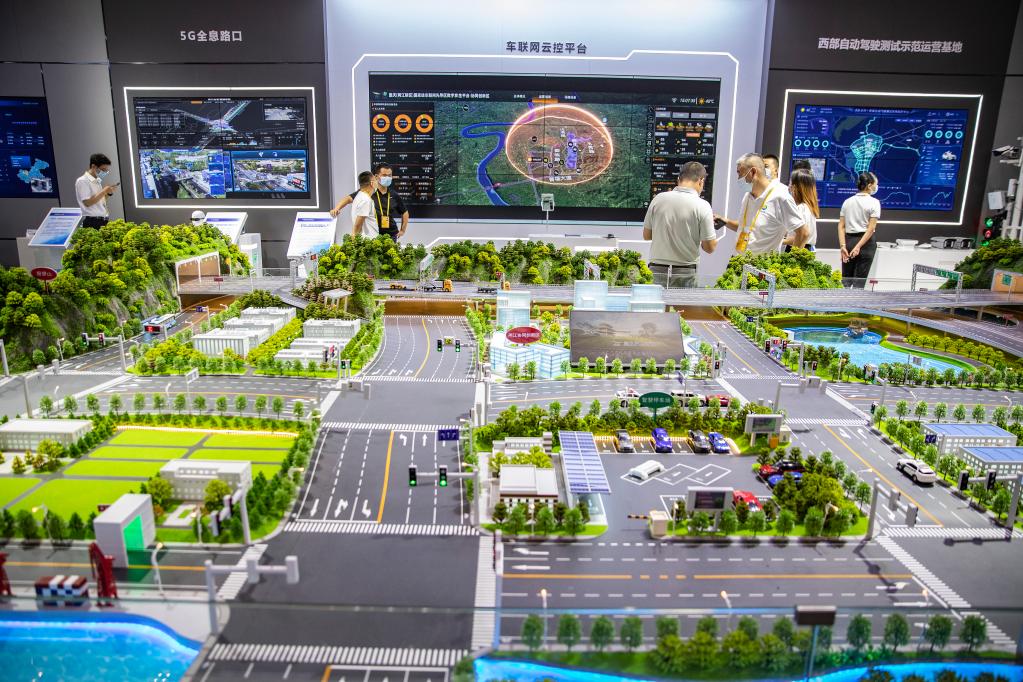 嘉宾在2022中国国际智能产业博览会重庆展厅内参观车路协同沙盘。新华社记者 黄伟 摄