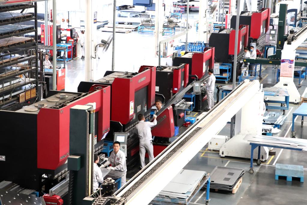 紧张生产中的中国西电集团西电宝鸡电气有限益达娱乐的钣金数控折弯加工线。(受访者供图)