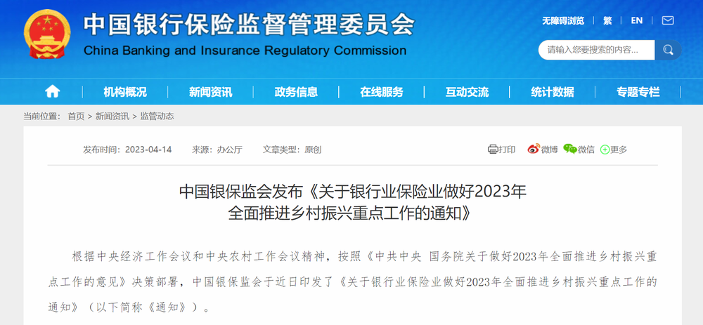 根据中央经济工作会议和中央农村工作会议精神,按照《中共中央 国务院关于做好2023年全面推进乡村振兴重点工作的意见》决策部署,中国银保监会于近日印发了《关于银行业保险业做好2023年全面推进乡村振兴重点工作的通知》(以下简称《通知》)。