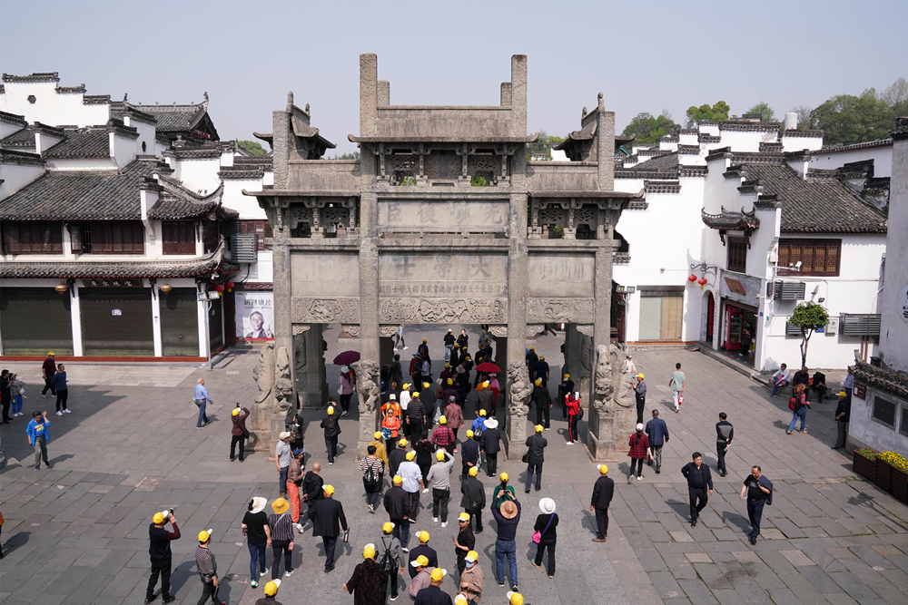 4月12日,在安徽省黄山市歙县的徽州古城景区,游客参观许国牌坊。新华社记者 马宁 摄