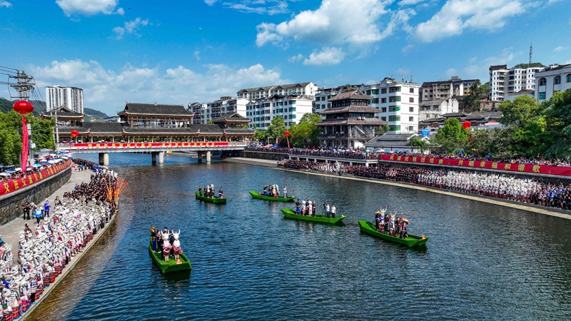 图为5月3日,人们在贵州省台江县参加苗族姊妹节对唱活动(无人机照片)。新华社图文