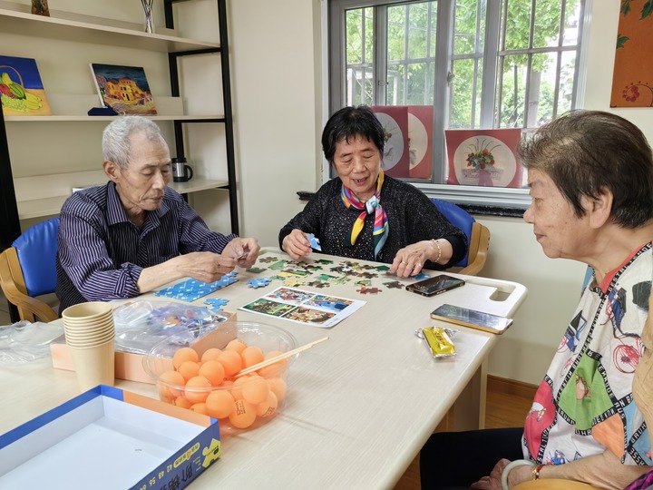5月27日,上海市普陀区真如镇街道一家老年人日间照料中心内,老人们正在玩拼图游戏。新华社记者吴振东 摄