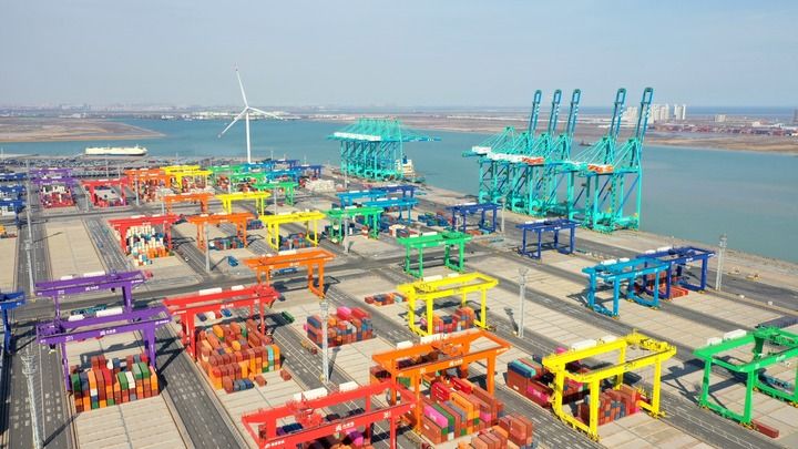 这是天津港全物联网集装箱码头(2023年2月21日摄,无人机照片)。新华社记者 赵子硕 摄