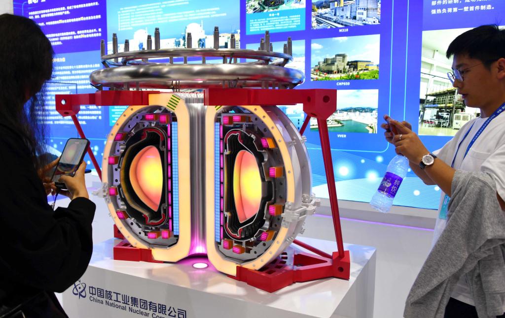 8月29日,在2023绿色低碳高质量发展大会装备展上,参观者在观看中国环流三号可控核聚变实验装置模型。新华社记者 徐速绘 摄