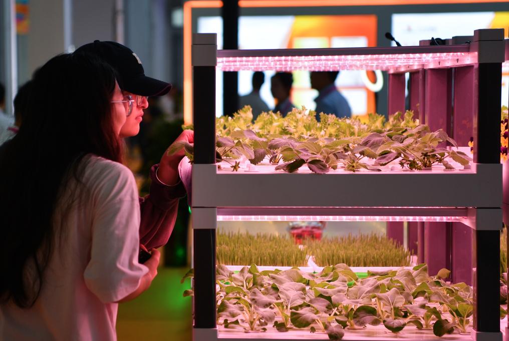 观众在陕西粮农展厅参观无土栽培作物。新华社记者 张博文 摄