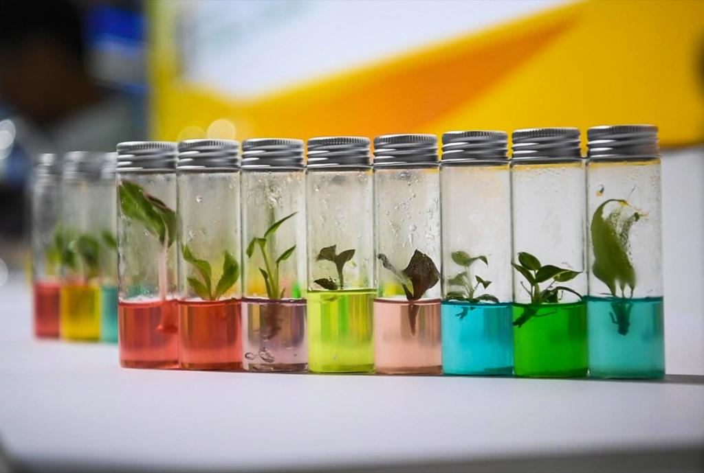 无土栽培技术正不断衍生出新的文创产品。在广东省科学院南繁种业研究所的展位上,一瓶瓶五颜六色的液体中生长的小绿植吸引了众人的目光。