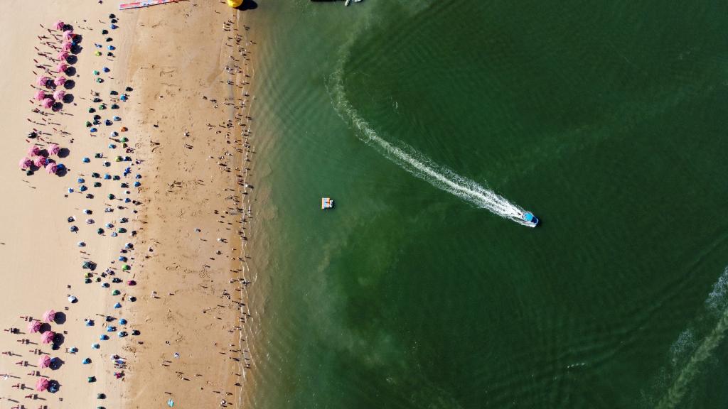 游客在天津市滨海新区东疆港人工沙滩游玩(无人机照片)。新华社记者 赵子硕 摄