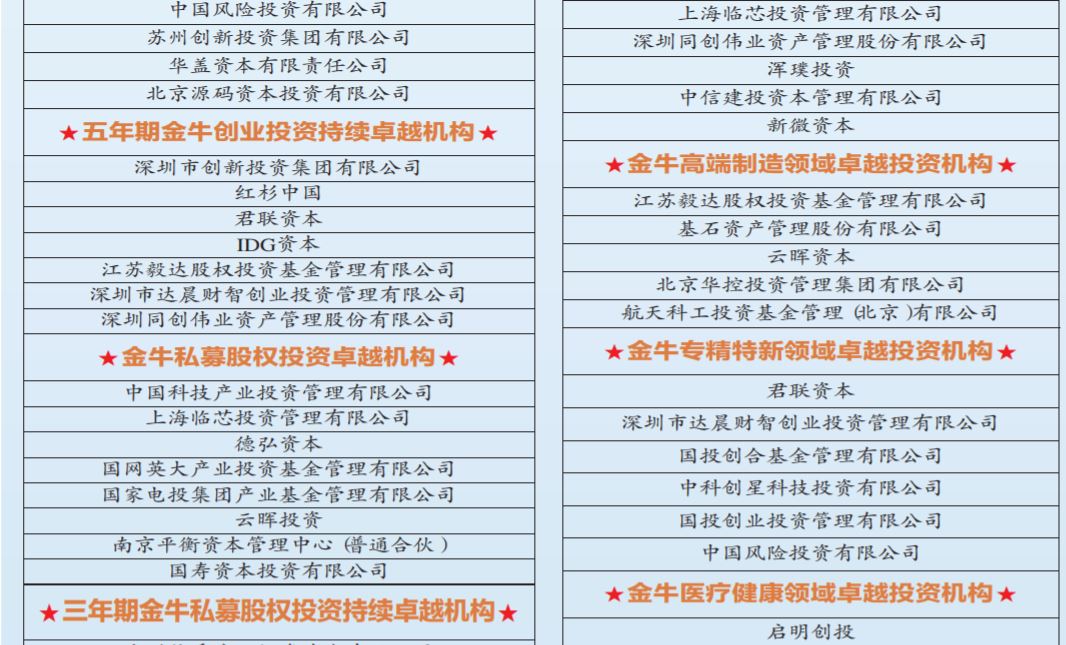 本届评选持续突出创新资本战略作用,大力促进支持科技创新。科技领域继续设立“金牛专精特新卓越投资机构”奖项,君联资本、达晨财智、国投创合、中科创星等机构获得该项称号。