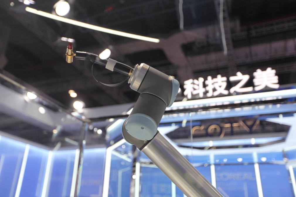 在本届进博会上展出的可以实现自动化妆功能的机械臂。新华社记者 马知遥 摄