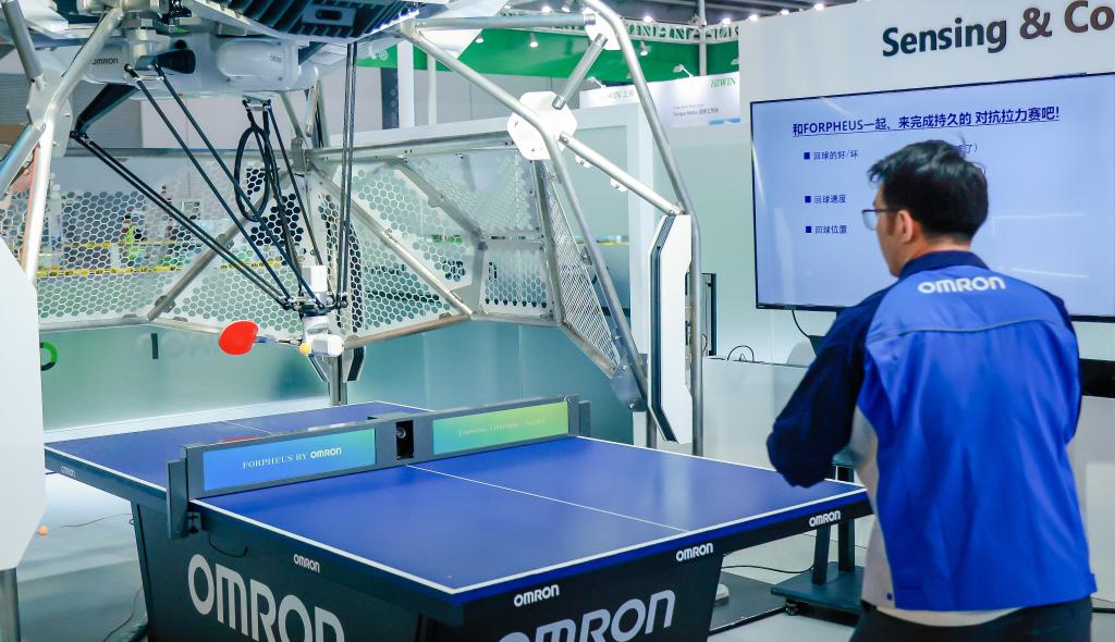 在技术装备展厅的欧姆龙展区,一场人机之间的乒乓球对战正在开展,但在飞速反应的机器陪练面前,人类选手纷纷败下阵来。