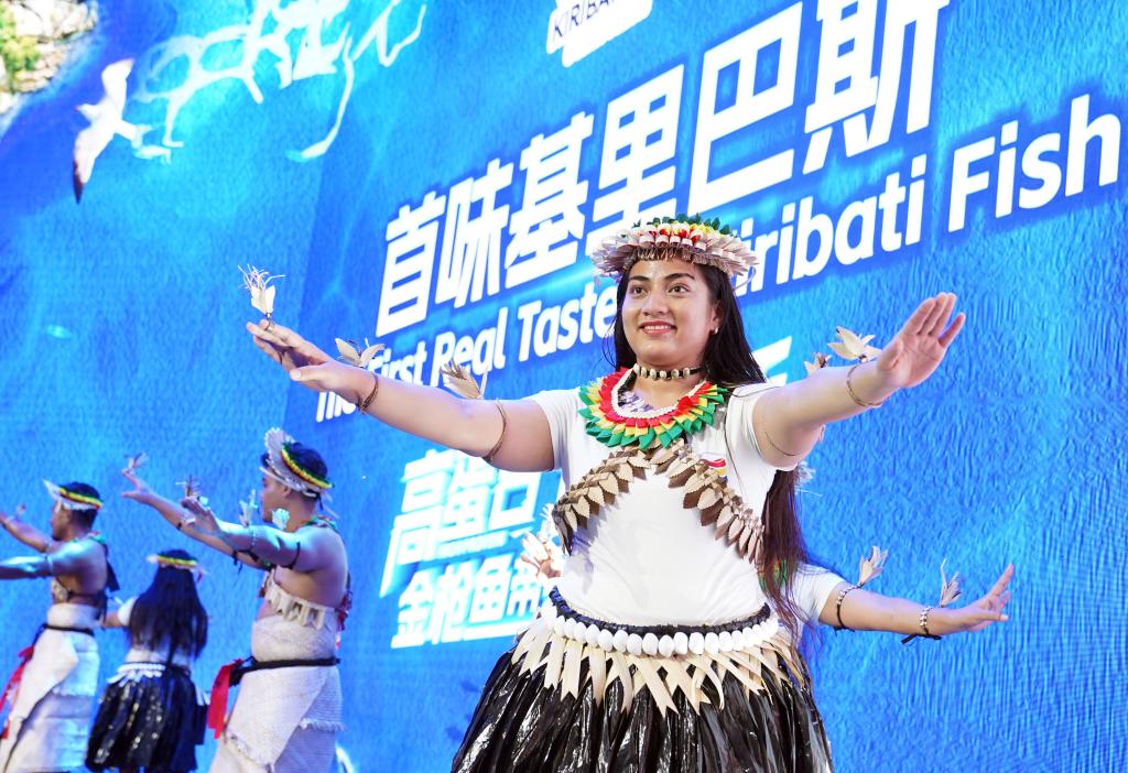 11月8日,来自基里巴斯的参展人员在基里巴斯水产品推介活动上表演。新华社记者 刘颖 摄
