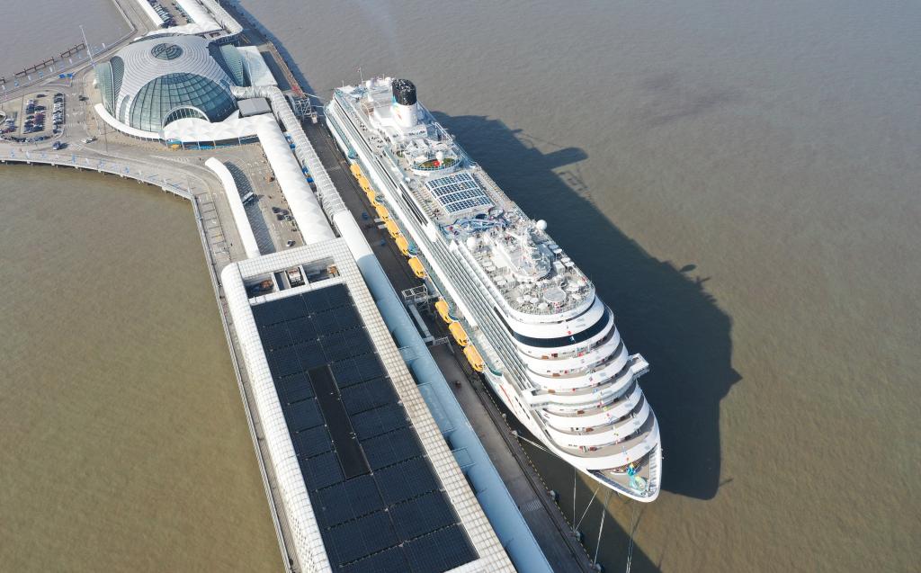 1月1日,“爱达·魔都号”停靠在上海吴淞口国际邮轮港(无人机照片)。新华社记者 丁汀 摄