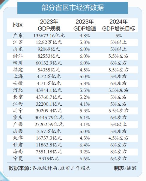 记者梳理发现,对比2023年经济增长水平,目前有7个省区市将2024年预期目标调高,4个省区市的预期目标与2023年持平。
