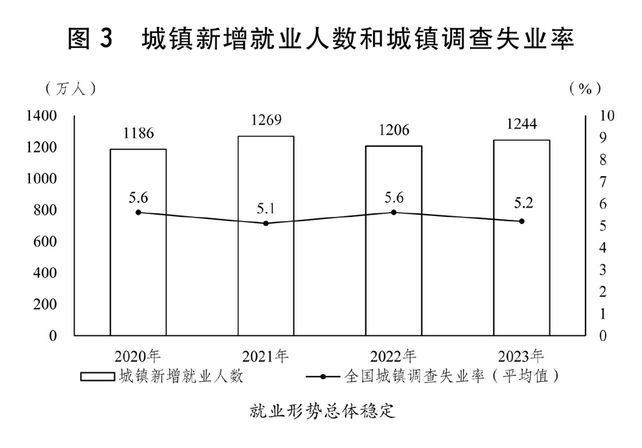 ——城镇新增就业1200万人以上,全国城镇调查失业率5.5%左右。关于城镇新增就业:主要考虑是,2024年新成长劳动力规模仍然较大,农村劳动力转移等就业结构调整也需要新的就业岗位,城镇新增就业目标由2023年的“1200万人左右”调整为2024年的“1200万人以上”,既是稳就业、调结构、增信心的客观要求,又体现了稳就业工作的力度和决心。关于城镇调查失业率:主要考虑是,在2024年经济运行风险挑战增多、重点人群就业压力较大的情况下,将预期目标稳定在5.5%左右,体现了就业优先的政策导向。
