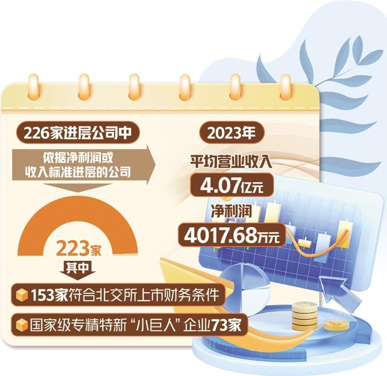 此批新进创新层的益达娱乐完成进层后,本年累计进层益达娱乐达298家,2023年平均实现营业收入4.17亿元,实现净利润4311.63万元,平均净资产收益率15.73%,近两年营业收入和净利润复合增长率分别为12.47%、20.06%。