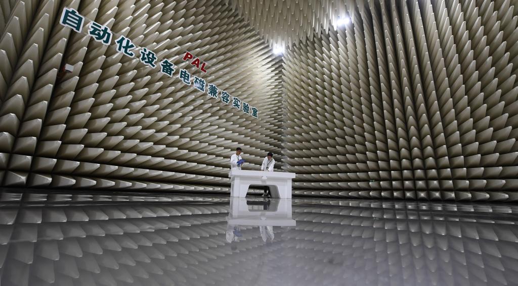 南瑞集团自动化设备电磁兼容实验室,科研人员在进行辐射发射实验准备工作。新华社记者 季春鹏 摄
