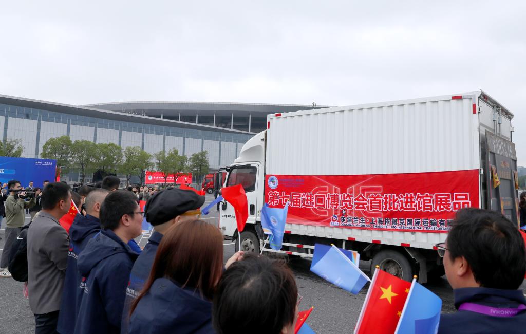10月22日,装载首批进馆展品的卡车驶入仪式现场。当日,第七届中国国际进口博览会首批展品进馆仪式在国家会展中心(上海)举行。新华社记者方喆摄