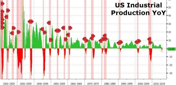 金融博客网站Zerohedge撰文称,过去100年中工业生产数据共有19次连续三个月收缩,其中17次预见到美国经济陷入衰退。1月工业生产年率下滑0.7%,为连续第三个月下滑。过去100年中,仅1934年和1952年当工业生产连续三个月下滑时未恰逢经济陷入衰退,而当前的下滑幅度大于1952年。