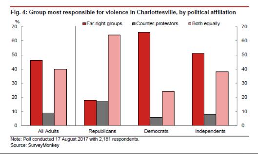 最近闹得满城风雨的“白人至上”风暴中,媒体一片负面报道。不过民调显示,共和党内部对于事件的观点较为温和,64%的共和党人认为暴力双方负有均等的责任。