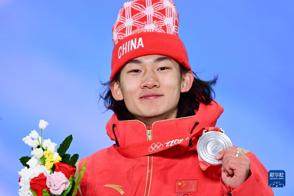 2月7日,亚军中国选手苏翊鸣在北京2022年冬奥会单板滑雪男子坡面障碍技巧奖牌颁发仪式上。新华社记者张宏祥摄