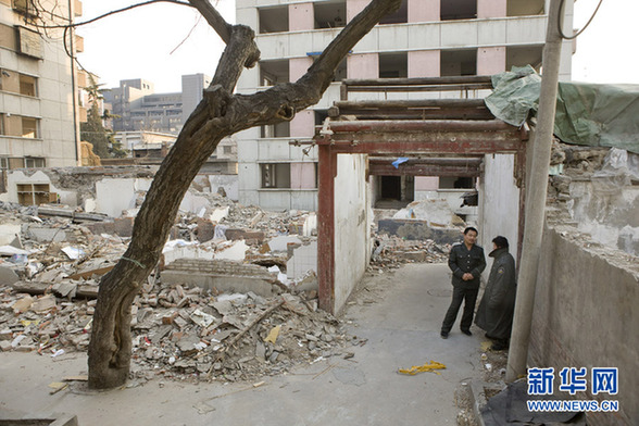 资料图片:1月27日,保安在梁思成、林徽因故居残破的门楼旁聊天。新华社记者 沈伯韩 摄