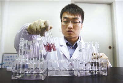5月5日,北京智云达食品安全检测消费者体验中心,实验人员在比较4份不同颜色的粉条溶液。