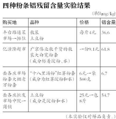 事实上,粉条今年已查出过问题。上月,北京市食药监局在全市停售“兴军一奇”牌劲大粉条,该粉条被检出铝含量为111毫克/千克,而按规定铝在粉条中是不得检出的。