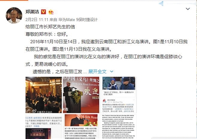 2月4日晚,郑渊洁收到丽江市长郑艺回复的电子邮件,并将其截图发布在微博上。记者从丽江市政府办公室获悉,该信件确实是郑艺给郑渊洁回复的。
