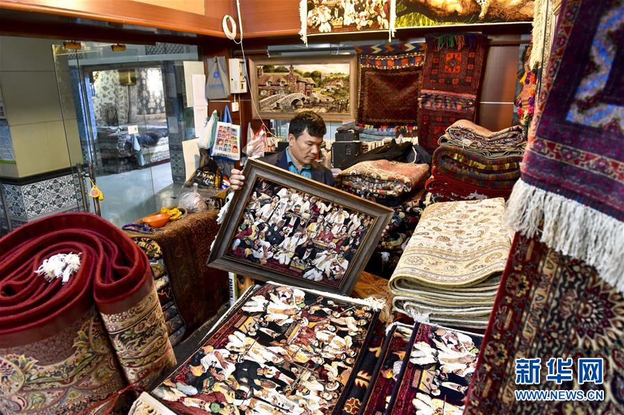 2006年,阿富汗商人福来敦·哈吉·巴里来到中国经营地毯生意,如今他在乌鲁木齐的新疆国际大巴扎开起地毯商铺,出售来自阿富汗、伊朗等国的地毯。今年3月,48岁的福来敦和他的新疆妻子古丽米热姆花60多万在乌鲁木齐买了一套房,接下来他还想扩大店面,把生意做得更加红火。“我的一切都来自地毯,我要在中国好好生活和工作下去。” 福来敦所在的新疆国际大巴扎是新疆旅游业产品的汇集地和展示中心,现在已经有30多名来自阿富汗、巴基斯坦、土耳其等国家和地区的商人在这里工作生活。新华社发(胡虎虎 摄)