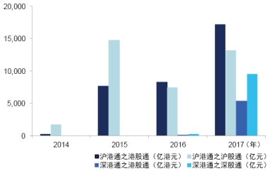 2014年4月“沪港通”得以正式批复,同年11月17日开通。交易标的从2014年北向沪股通596个和南向港股通273个扩大至2017年北向和南向分别为791个和311个,成交金额也从2014年的北向1675亿元和南向260亿港元增加至2017年北向1.31万亿元和南向的1.72万亿港元。