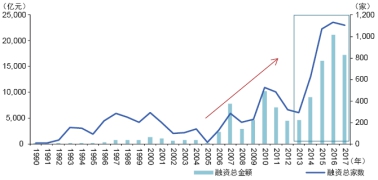 首先,资本市场在金融体系中的地位显著提升。自上个世纪九十年代国家交易所市场设立以来,资本市场的发行、交易和信息披露等各项制度逐步完善,市场服务实体经济能力稳步提升,投融资功能显著增强。根据Wind数据统计,从1990年到2017年,股票市场共计实现融资规模约11.45万亿元,累计融资8602次;且近十年股票市场融资功能明显增强,2007年以来融资规模约占总融资额的91.70%。