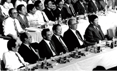 1991年8月28日中国证券业协会在北京人民大会堂召开成立大会,陈慕华等领导在大会主席台