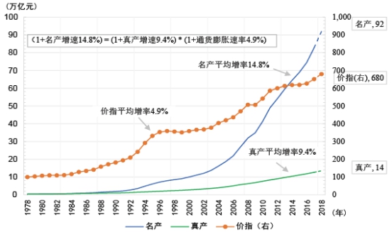 注释:1. 名产指名义产值,真产指真实产值;2. 2018年为预测值。